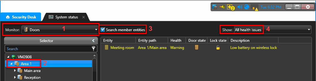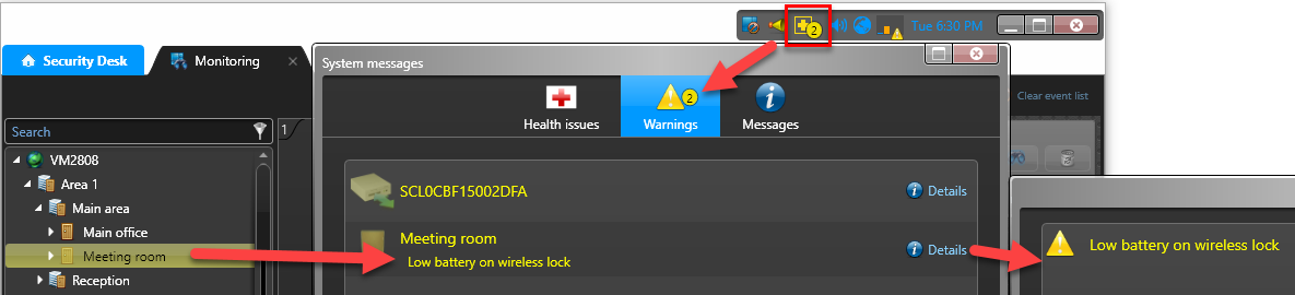 Für jedes WiFi-Schloss erstellt Security Center einen virtuellen Eingang mit dem Namen Eingang BatteryFail, der als Aktiv in der Registerkarte Überwachung und als gelbe Warnung auf dem Symbol Systemmeldungen in der Benachrichtigungsleiste angezeigt wird, wenn der Akku schwach ist.